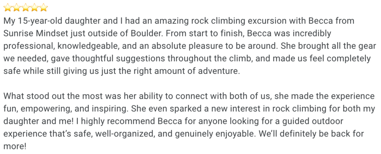 Beat the heat and live into the Sunrise Mindset this summer! See the sunrise from the Flatirons or from a multi-pitch in Eldorado Canyon. The morning glow, chirping birds and cool air make for a majestic way to start the day. Wake up for life for real with this one. This is premium life experience!