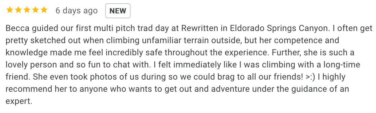 • Skill instruction: lead climbing, cleaning anchors, multi-pitch, rappeling, technique etc.